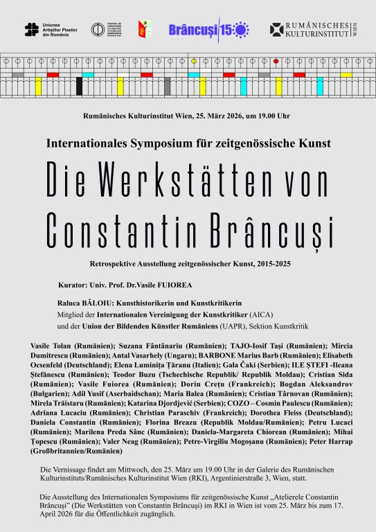 Institutul Cultural Român de la Viena Expoziție retrospectivă de artă contemporană 2015-2025 Simpozionul Internațional de Artă Contemporană „Atelierele Constantin Brâncuși”. Institutul Cultural Român de la Viena organizează Miercuri, 25 martie 2026, ora...